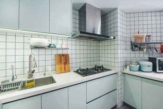 白色墙砖配新鲜漆柜,视觉效果极佳。灯带安装在柜体底部,方便日常操作。
