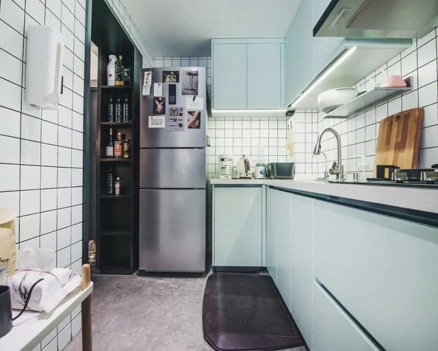 厨房空间不大,玻璃推拉门是隐藏的,看起来是开放式厨房。冰箱旁边设计了隔断柜,可以添加收纳和装饰。