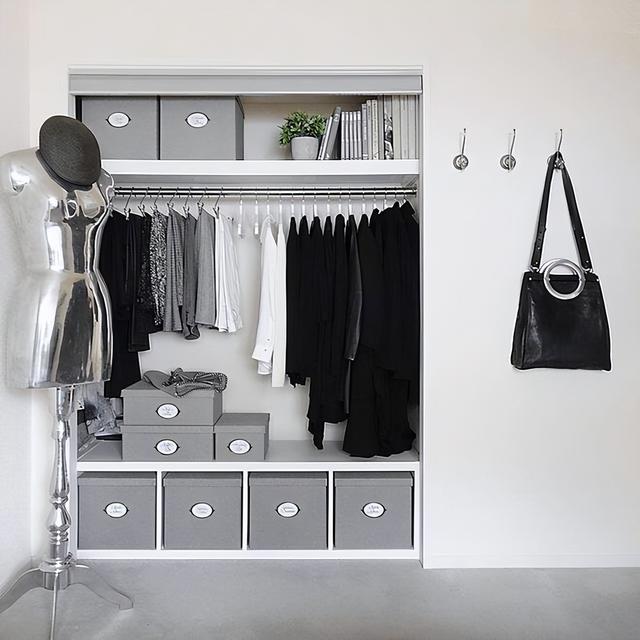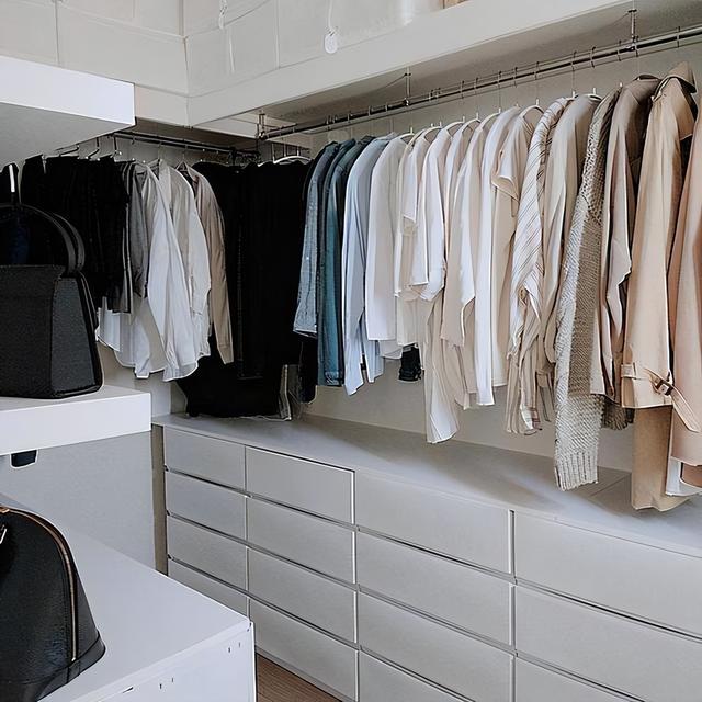 换季或不常用的衣服,装在统一的收纳袋里,放在高处。换季经常穿或者不方便折叠的衣服一般挂在中间。抽屉可以用来存放换季的衣服和不方便悬挂的内衣、袜子、饰品等。
