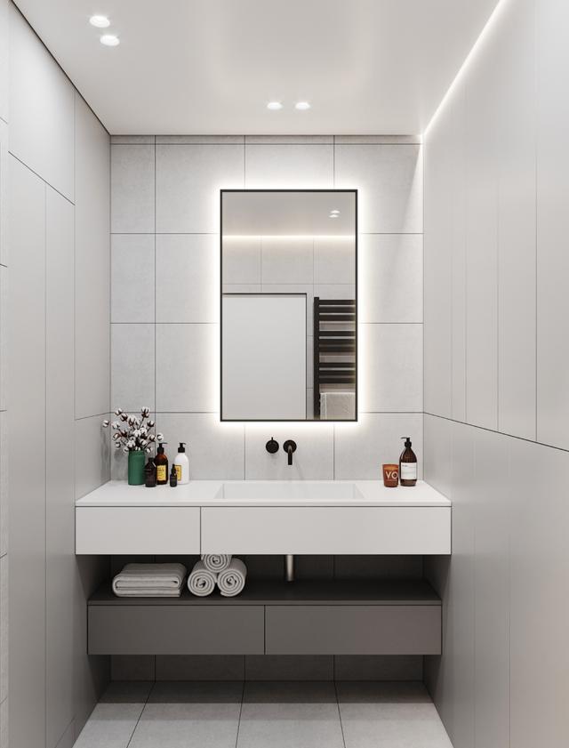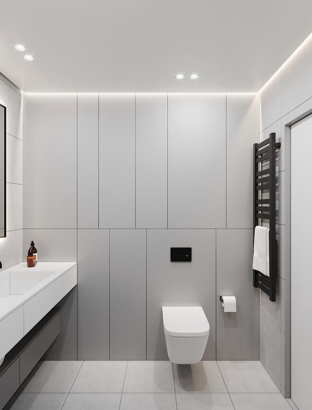 卫生间里,偏灰色调是主色调。