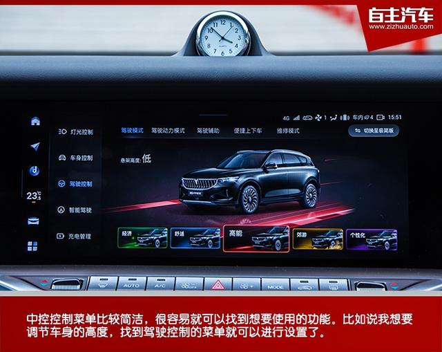 中控控制菜单比较简洁,很容易就可以找到想要使用的功能。比如说我想要调节车身的高度,找到驾驶控制的菜单就可以进行设置了。
