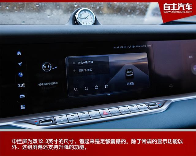 中控屏为12.3英寸的尺寸,看起来是足够震撼的。除了常规的显示功能以外,这组屏幕还支持升降的功能。