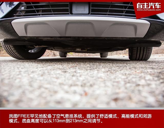 岚图FREE罕见地配备了空气悬挂系统,提供了舒适模式、高能模式和郊游模式,底盘高度可以从113mm到213mm之间调节。