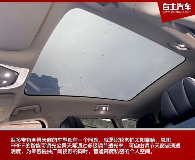 很多带有全景天窗的车型都有一个问题,就是比较害怕太阳暴晒。岚图FREE的智能可调光全景天幕通过多级调节透光率,可自由调节天窗玻璃透明度,为乘客提供广阔视野的同时,营造高度私密的个人空间。