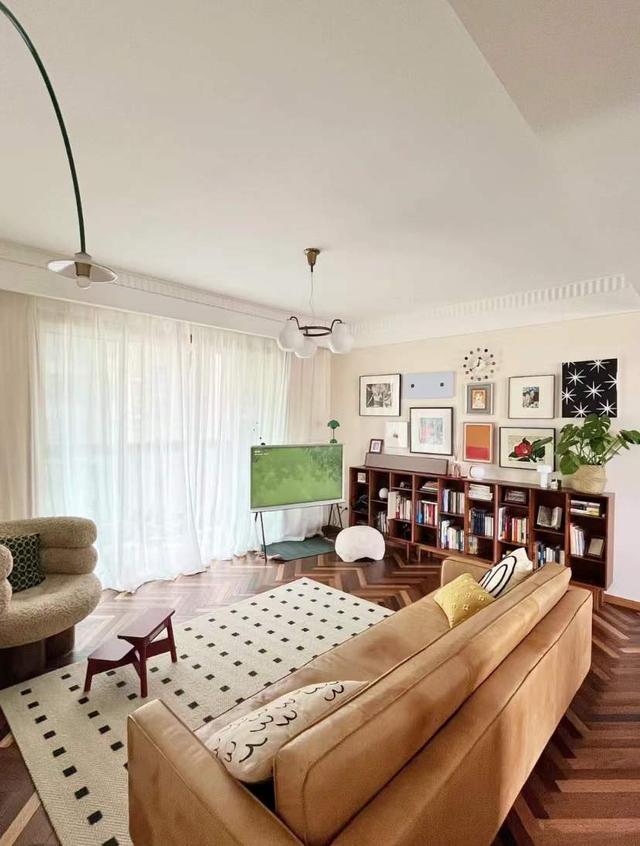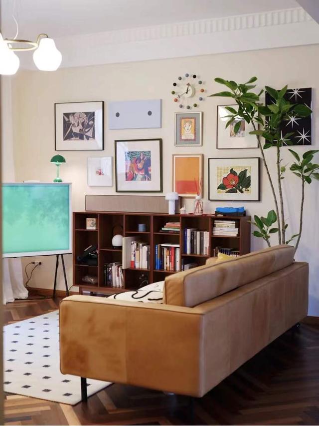 客厅没有做任何墙面设计。它是用一种乳胶漆硬装的,后来配了橱柜和装饰画。简单又有设计感,这就是轻硬装重软装的精髓。