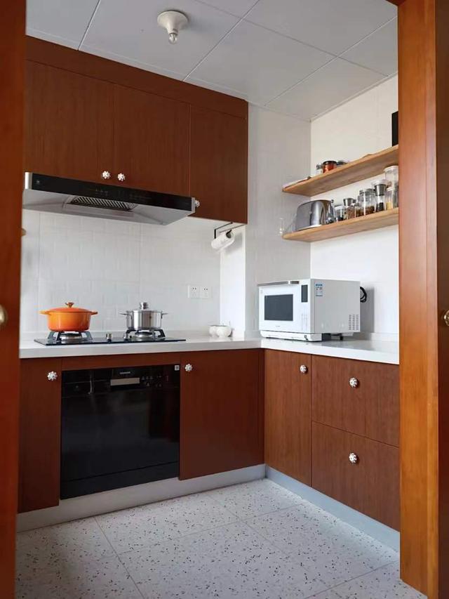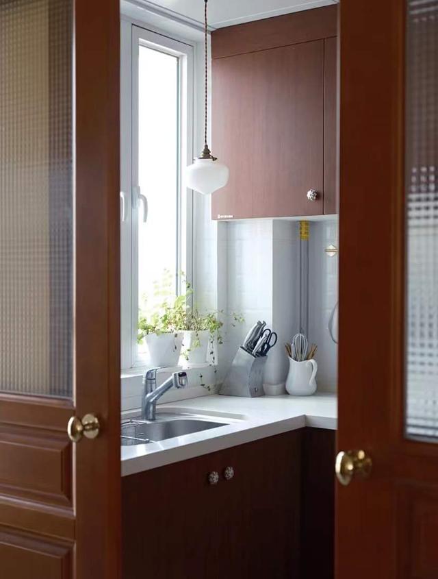 厨房的地板、墙壁、台面、顶面都是浅色的。厨房的空间不够小,大面积的浅色还是会显得敷衍。增加红木柜门不仅可以统一整体风格,还可以增加厨房的色彩层次感。