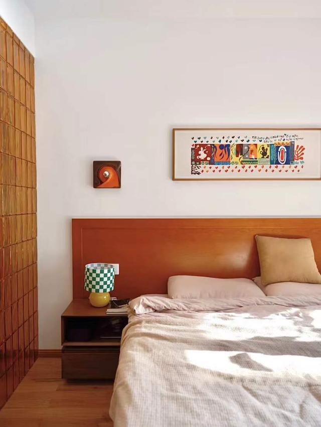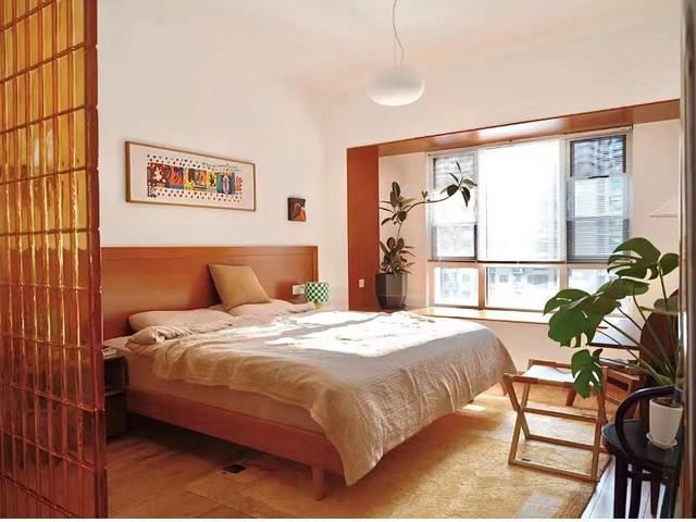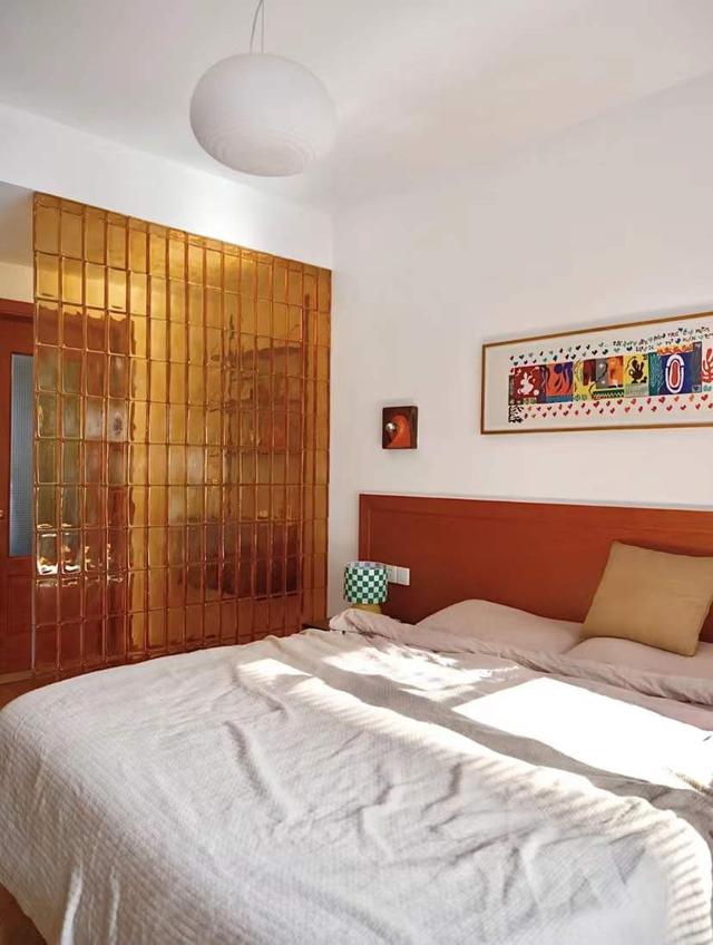 原来的衣帽间空间被压缩后,睡觉的地方会更宽敞。用棕色玻璃砖搭建了新的隔断,可以改变卫生间门对着床的尴尬。