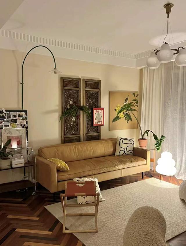 客厅和玄关地板是人字形实木地板,单层的要花一些。但是有了浅色的素面墙,一切看起来都刚刚好。