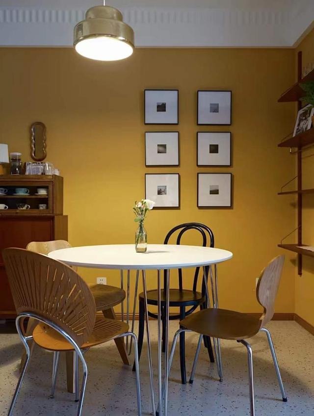 房子装修前期,女主人本来打算装中国风的,但是在选择乳胶漆色卡的时候,喜欢这种有些鲜艳饱和度低的卡其色,想拥有这样的空间。我放任自己,在餐厅画的,因为加上这个颜色,中国风肯定走不了。不知道现在什么风,后期搭配各种家具和装饰品后,有一种说不出的艺术感。
