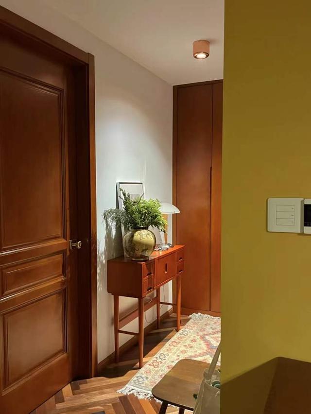 玄关右侧是顶天立地的柜子,红木材质,有高级感,让柜子既是收纳空间又是装饰板。