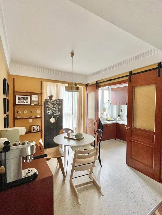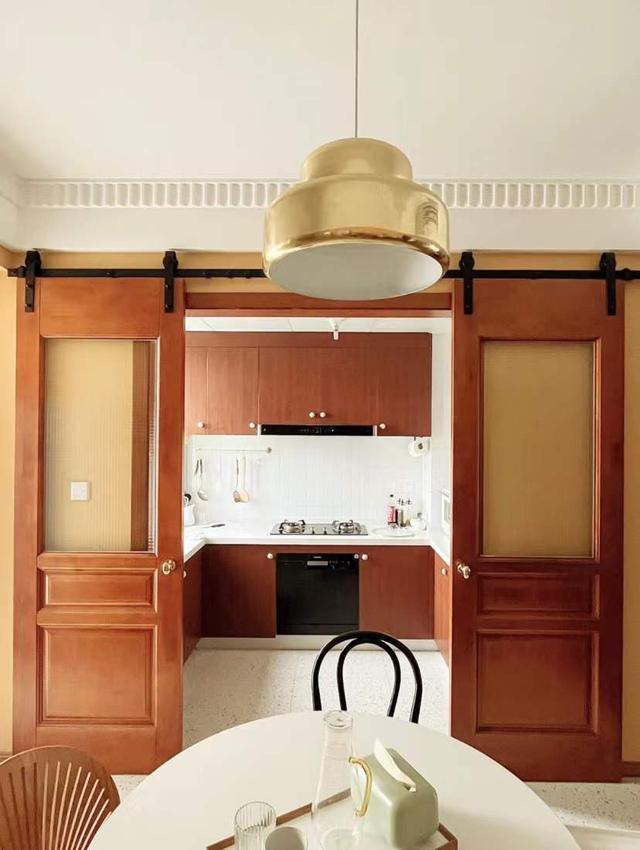 用实木和波纹玻璃把厨房的玻璃推拉门改造成仓门,既能最大限度地利用门洞空间,又能起到很好的装饰作用。作为室内门的天花板,仓门真的很漂亮。