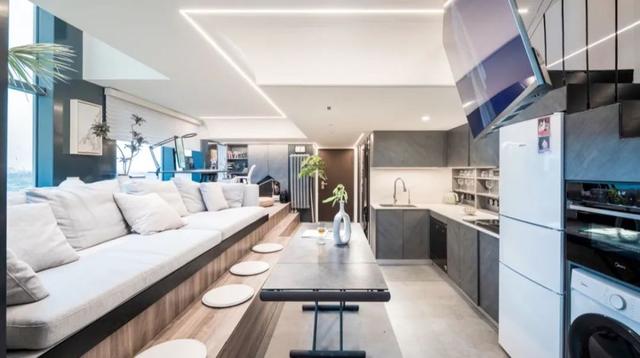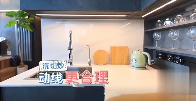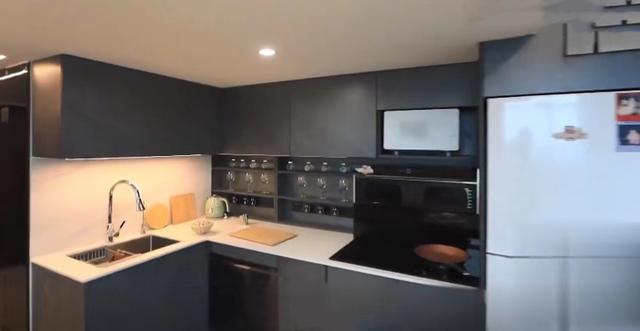 厨房简约高级,L型厨台移动流畅,更易操作。还有大容量的柜子。悬挑楼梯下方是储物空间,放置家用电器。