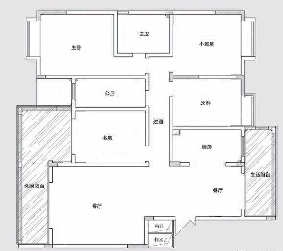 为了使空间划分更加清晰,在玄关的左右两侧设计了门洞,从而明确划分出一个空间区域。此外,过道区还设计了一套鞋柜,方便进出换鞋。客厅旁边的大阳台分为两个休闲阳台;扩大后的空间作为小花园,采光好,也很适合养花。卫生间采用干湿分离设计,盥洗室采用双面盆设计。四间卧室规划为主卧室、儿童房、次卧和书房。
