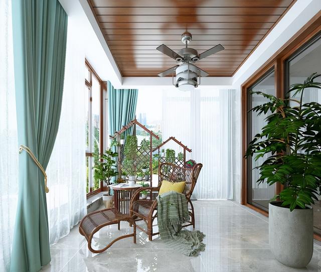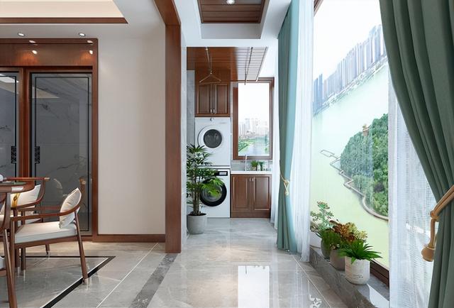生活阳台的空间面积也比较丰富,相对“长”的空间格局,餐厅和餐厅之间没有门,可以让两个空间看起来比较明亮。在不挨着餐厅的区域晾衣服是划分生活阳台功能区的好方法。