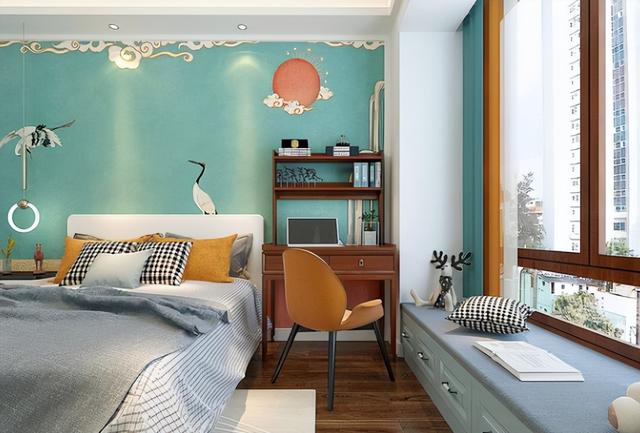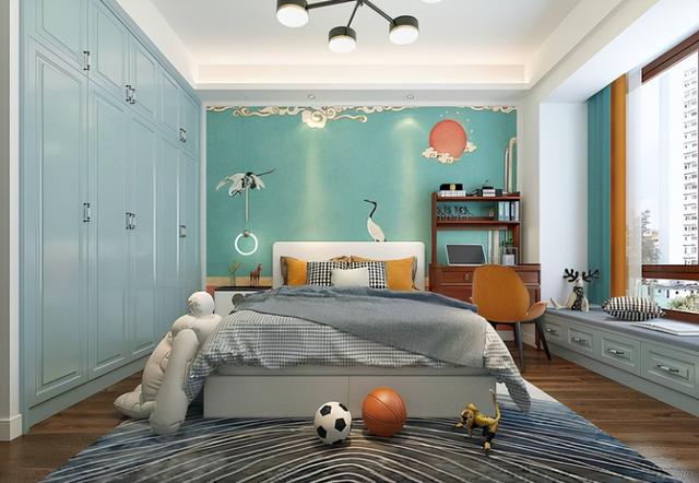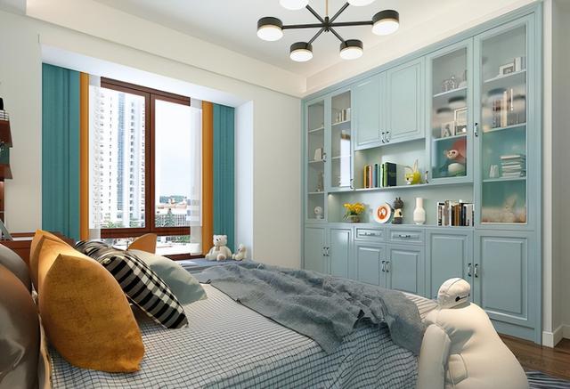 儿童房和主卧一样,砸了飘窗,设计了飘窗柜。色彩更符合青少年,更活跃。床尾的一整幅壁画成了整个卧室的主题,衣柜的色彩选择也很温馨。