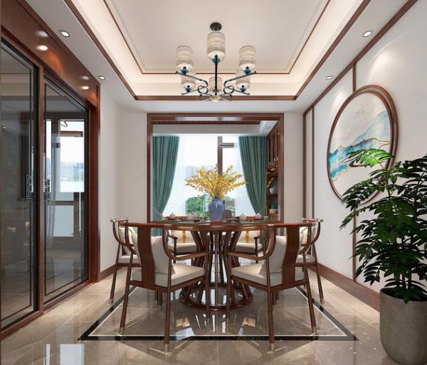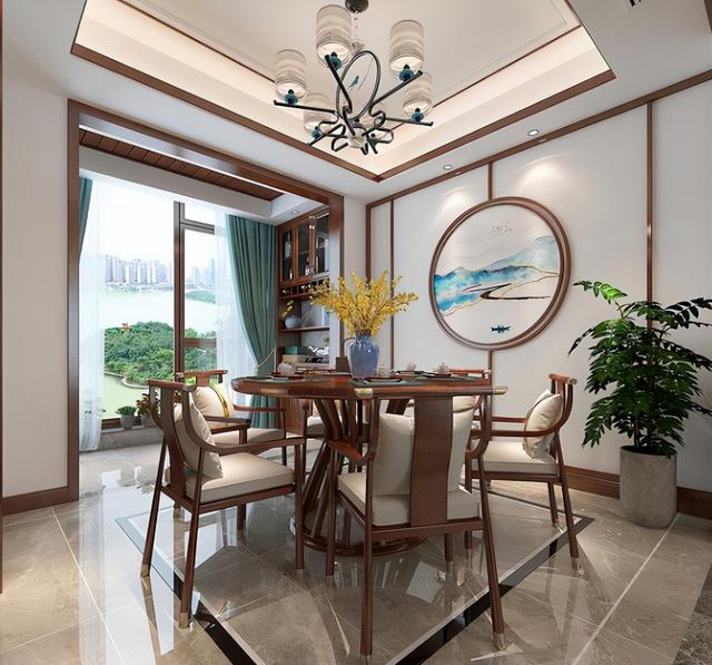 餐厅是一个正方形的空间。虽然不大,但是摆个圆桌还是很合适的。餐厅地面做的镜面瓷砖非常精致。虽然没有酒柜,但是墙上有一个中间有一圈的造型,点亮了中国风的美。