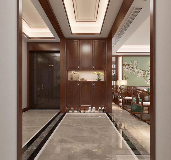入口分为两个区域,一个是入口,另一个是与走廊连接的区域。入口正对端景处理,中式小家具和装饰摆件别有一番韵味。顶部一圈的设计给人一进门的即视感。