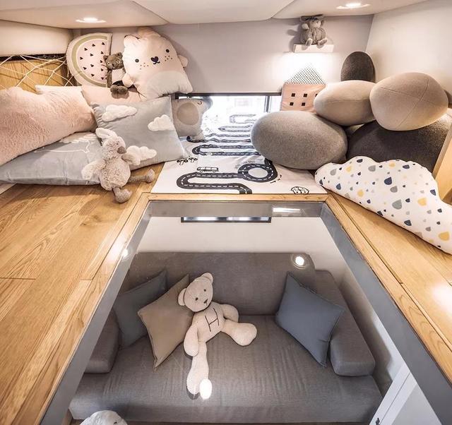 卧室采用榻榻米设计,婴儿床隐藏在榻榻米下,可以直接拉出打开,日常使用。这个设计合理地利用了空间。