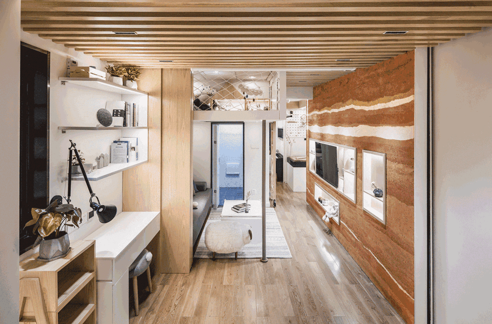 在主空间,因为空间有限,隔断对视觉是很大的障碍。在这里,设计师尽量减少门和隔断,保证视觉不压抑,让长期居住能有更好的适应性。