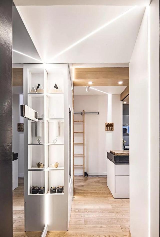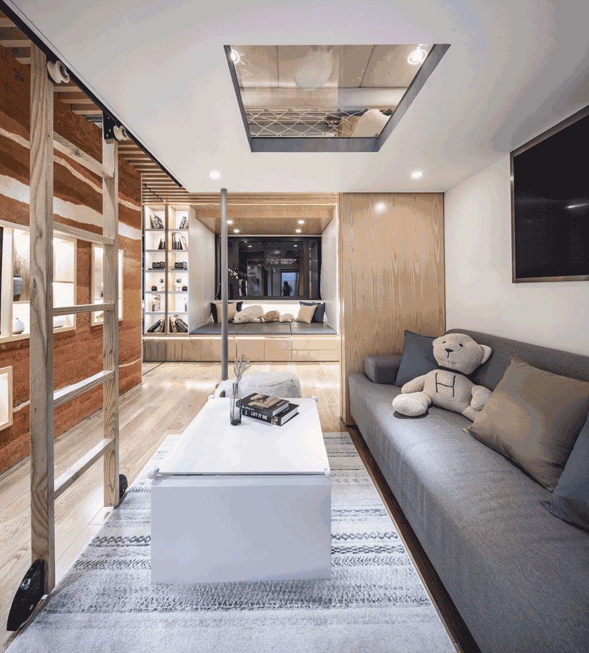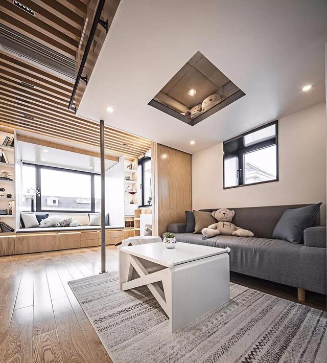 在主空间的沙发上方,为了增加采光和通风,在天花板上做了一个玻璃天窗,使得上部空间成为一个独立开放的阁楼。它可以用来存放你平时不需要的东西。