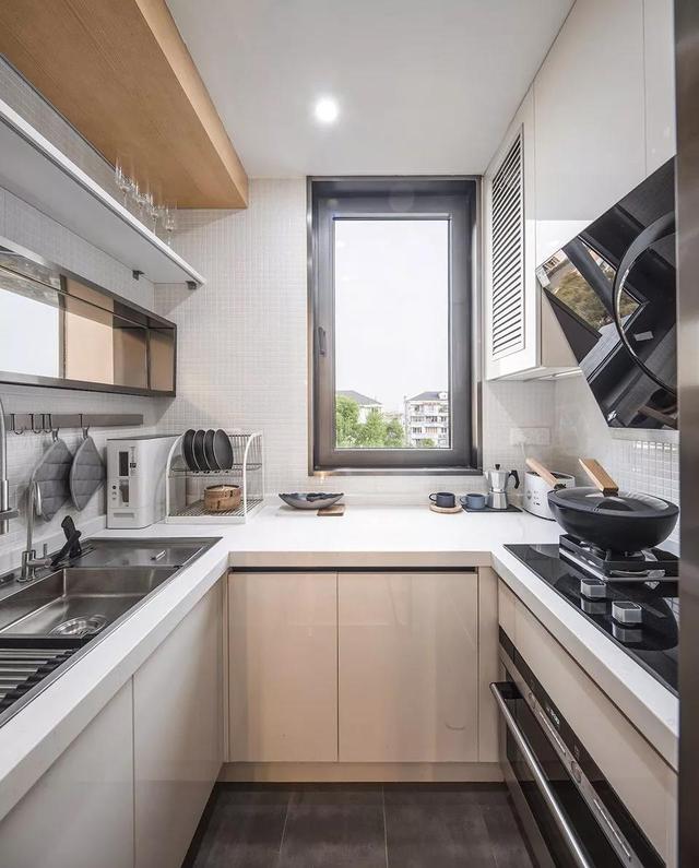 厨房操作区有一个U型柜,转身就能兼顾洗菜和炒菜。中间的窗户是切菜区。