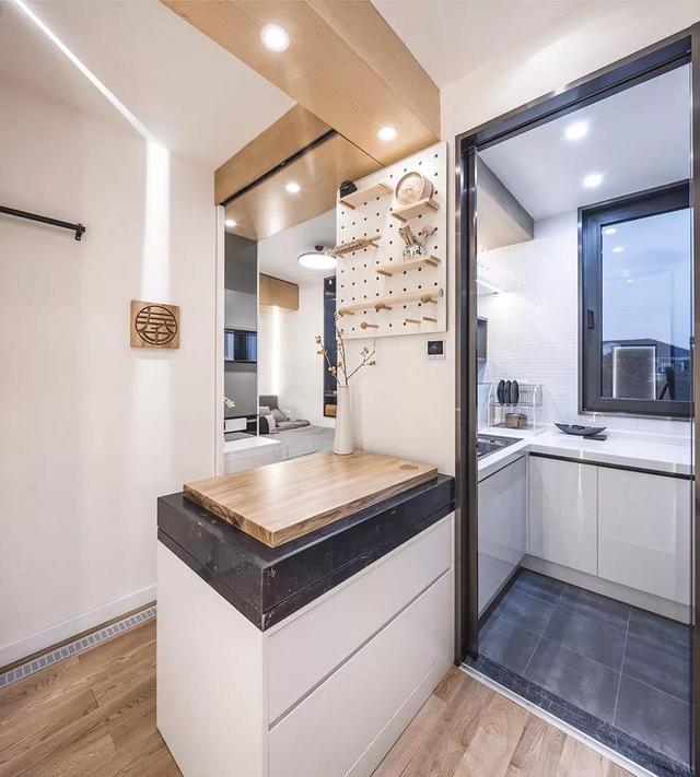 改造后的厨房看起来干净整洁,中间的吧台可以做岛台,解决了厨房很多空间。这里的桌面是可移动的,看起来很有设计感。