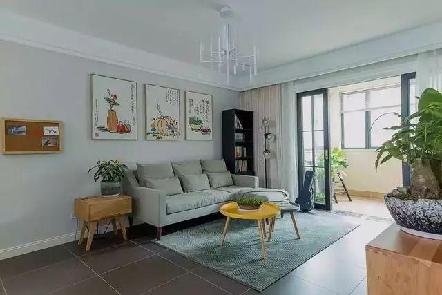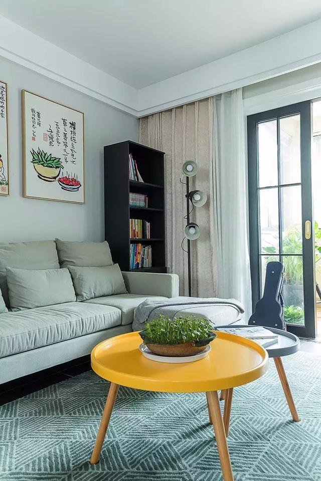 小细节图。柠檬黄和浅蓝色的圆形小茶几提亮了整个空间,用小清新绿植代替鲜花,原来也可以这么美!靠墙的柜子用来摆书,彰显出文化品味。