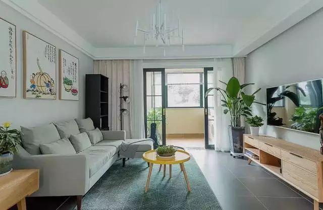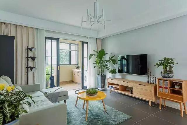 电视柜和小边柜,都是浅色原木风,配上盆景和大绿植,散发出浓浓的大自然气息。深灰色地板也非常大气呢。