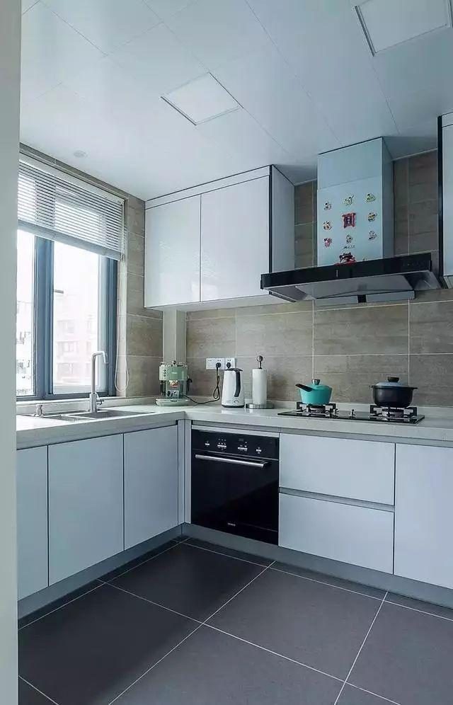 厨房给人的感觉,就是,大方,洁净,明亮。黑白灰可谓是经典搭配,结合仿木纹墙砖,感觉整个空间都设计得特别精致。