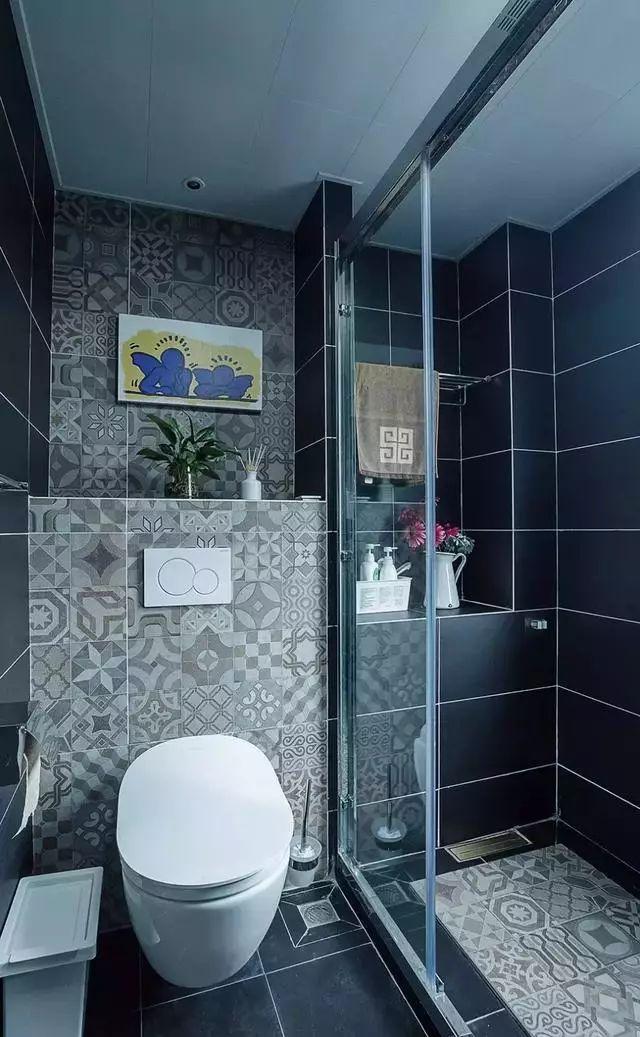 卫生间的话,色调搭配偏沉稳一些。因为黑色的基础上加入了花砖元素,整个空间显得更加时尚。壁画,绿植,鲜花,营造出清新的氛围。