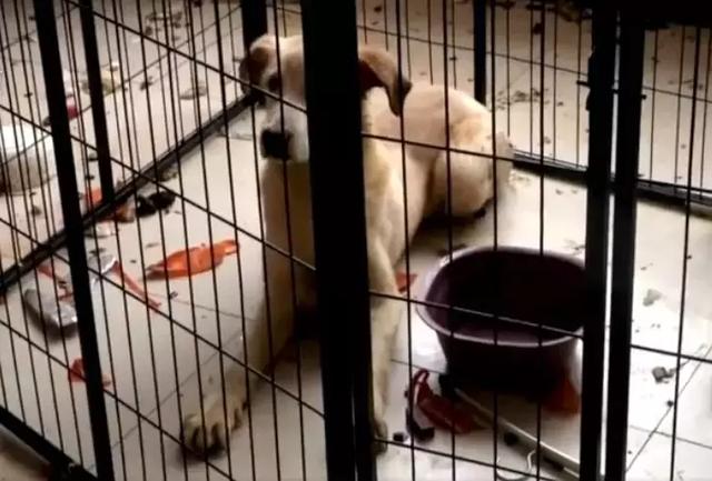 整个房间都是臭味,狗笼里全都是垃圾,狗狗的水、粮、能吃的也全吃光了,笼子里很多屎、尿。