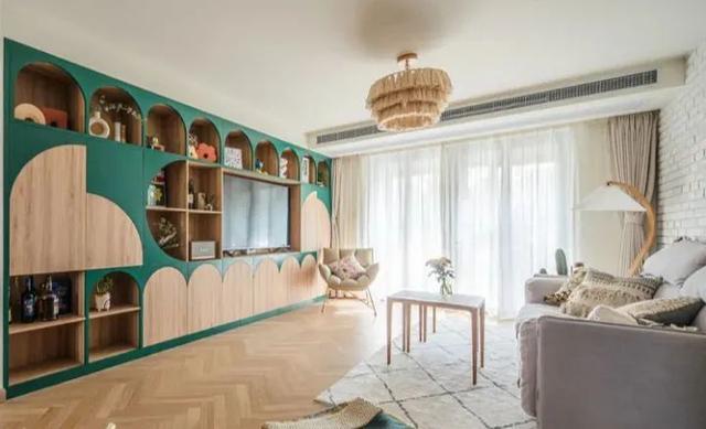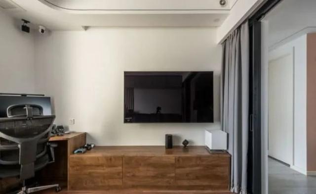 一套嵌入式电视柜是整面墙做的,基本和墙平齐,不占用客厅本身的空间。不仅是电视柜,储物能力也不差。电视不在C位,第一眼你甚至注意不到电视。
