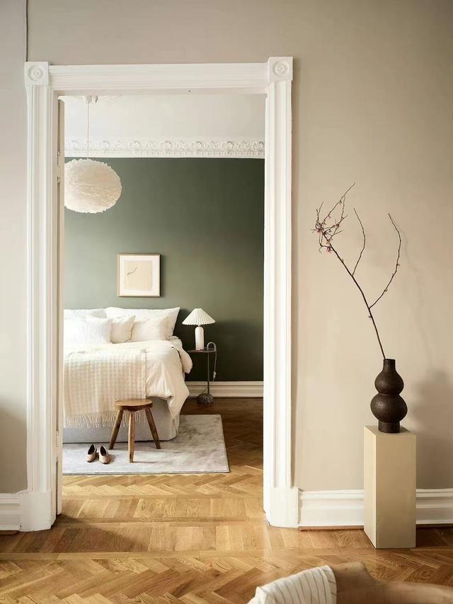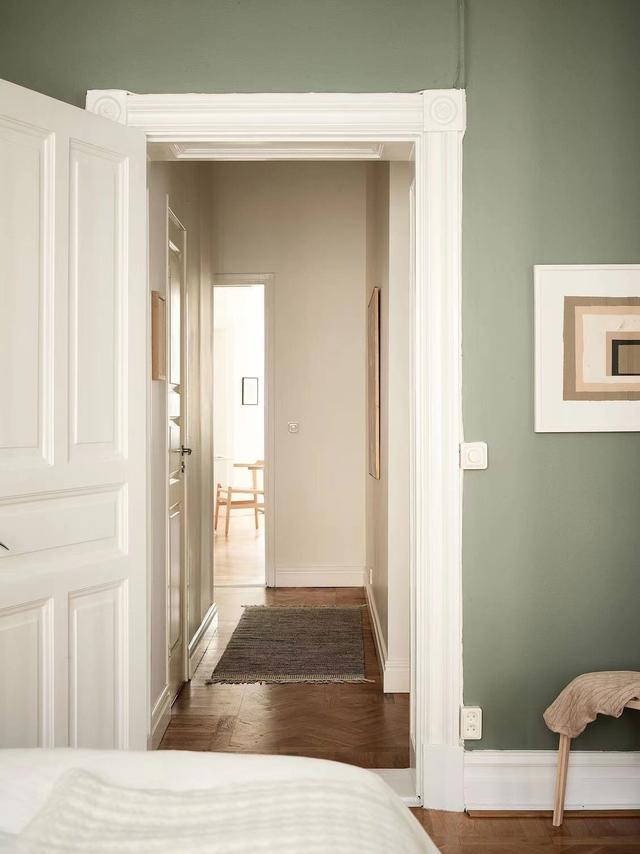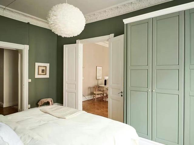除了绿色的墙,还有绿色的衣柜,白色的门和踢脚线,经典的和谐驱散内心的烦躁。整个空间不那么古板,住着也很惬意。