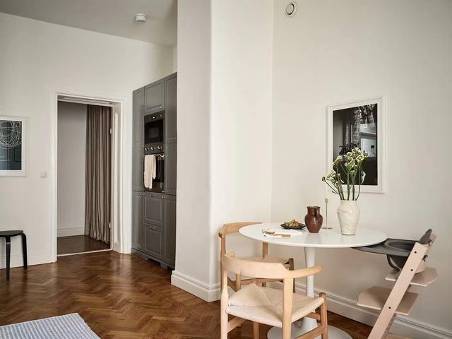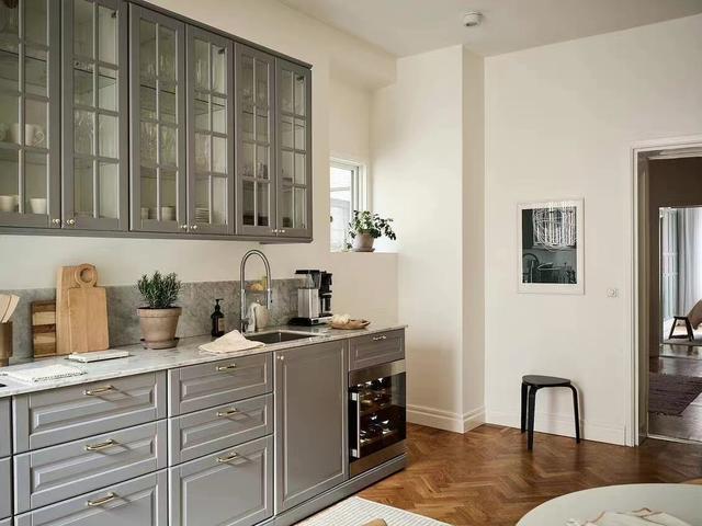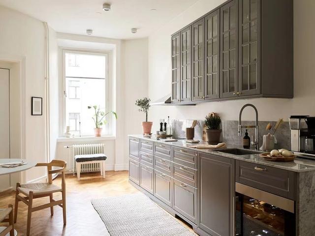 在这个普通简单的北欧厨房里,灰色门板和格子玻璃的组合,圆桌编织的休闲椅,按照小窗户对称排列,看起来很顺眼。