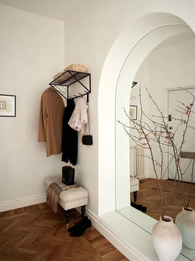 这个弧形小众的超大镜子的设计也是可以接受的,给人一种服装店般的试衣感觉。增加一面镜子本身就可以大大增加空间的开阔感,而被镶嵌在一个弧形的壁龛中则更加优雅精致。
