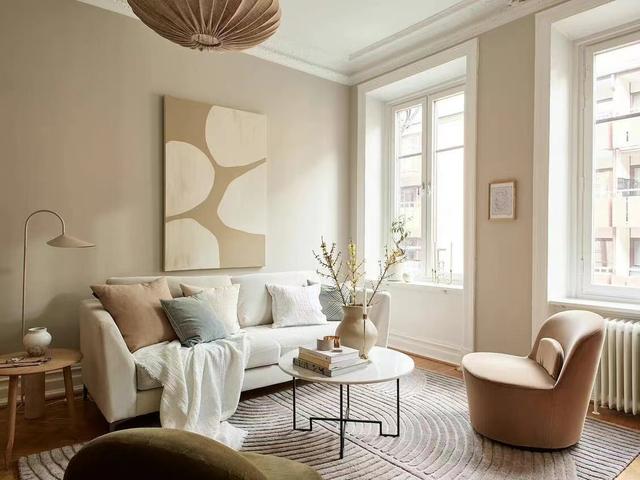 米色是时下最流行的配色经典。作为中性色调,米色的柔和让它百搭又舒适。比如这个客厅空间,从墙面到地面,从挂画到抱枕,米色主题真的美到人心。