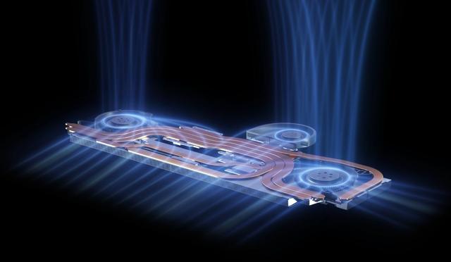 冰川散热架构3.0,3风扇5热管加全新风刃版冰翼鳍片设计,转轴处首次采用联排出风口,整机共计搭载330片薄至0.1mm的冰翼鳍片