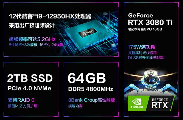 英特尔第12代酷睿i9-12950HX处理器+175W NVIDIA GeForce RTX3080Ti笔记本电脑GPU,支持“双显三模”显卡切换,双烤功耗达65W+175W(手动模式下)