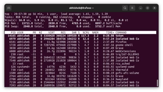 当你播放视频的时候你可以通过 top命令尝试查看名称为totem这个进程(那是默认视频播放器的名字)。