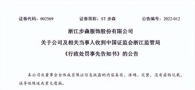 在2021年底,步森股份被立案调查,证监会浙江监管局向步森股份出具《行政处罚事先告知书》,王春江更是被处以30万元的罚款。