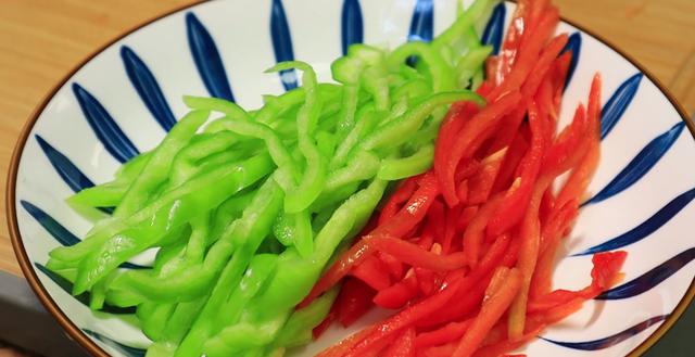 第一步、准备一个青椒洗净后切开,然后切成细丝,红椒切成细丝,切好装盘备用,我还准备了一些绿菜和豆芽,洗干净备用。