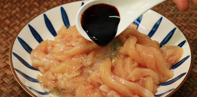 第二步、洗干净的鸡胸肉中间片开,再切成薄片,喜欢猪肉的话可以用瘦肉或者里脊肉,切好装盘腌制。