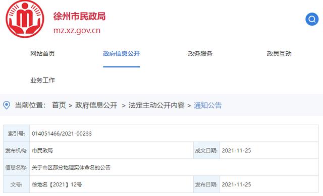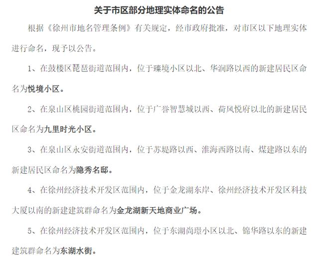 近日,徐州市民政局发布公告,根据《徐州市地名管理条例》有关规定,经市政府批准,对市区以下地理实体进行命名。