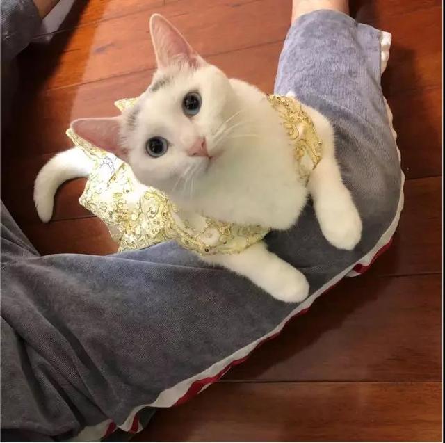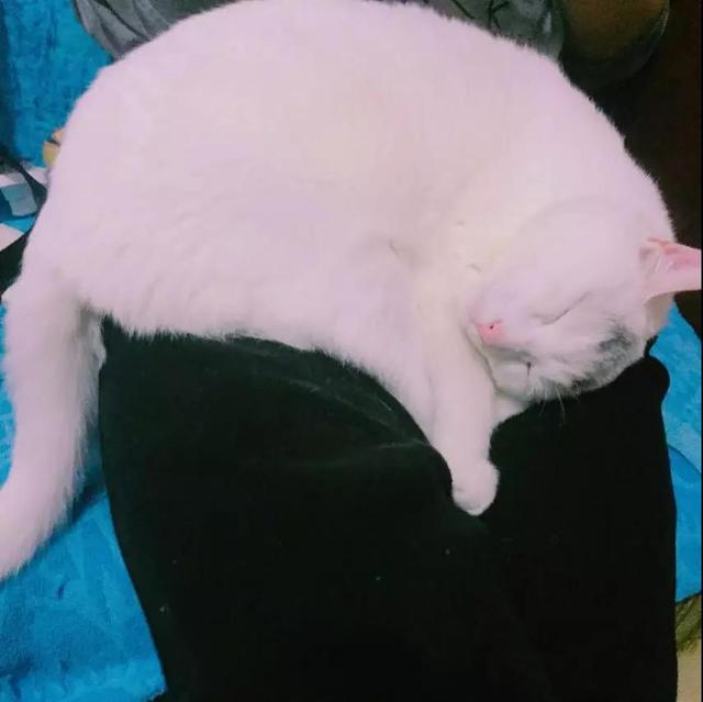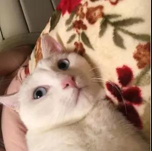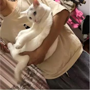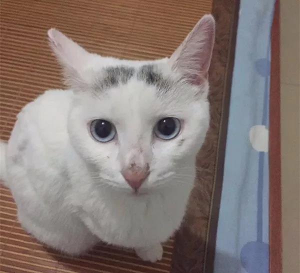 接到牠的时候我仔细端详:眼睛蓝蓝的,很漂亮;毛发全白,很干净。