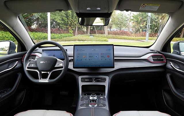 内饰采用环抱式座舱,全液晶仪表尺寸为8.8英寸,观感上比秦PLUS DM-i要好不少。中控屏根据车型的不同分为12.8英寸和15.6英寸,但都内置了DiLink 4.0智能网联系统。