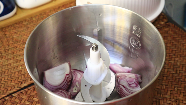 第二步、接着咱们准备1个洋葱切成块放入料理机里,把洋葱打成碎末。