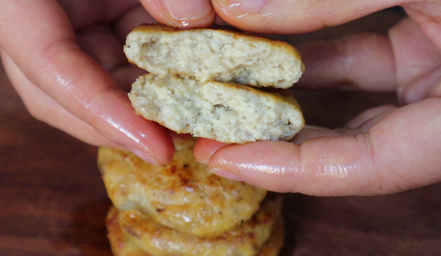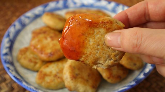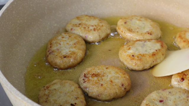第六步、锅里油热后放入鸡块中小火慢煎,底部定型之后,用铲子轻轻挪动一下,底部金黄之后翻面继续煎,一直煎到两面金黄,差不多5分钟就可以出锅了