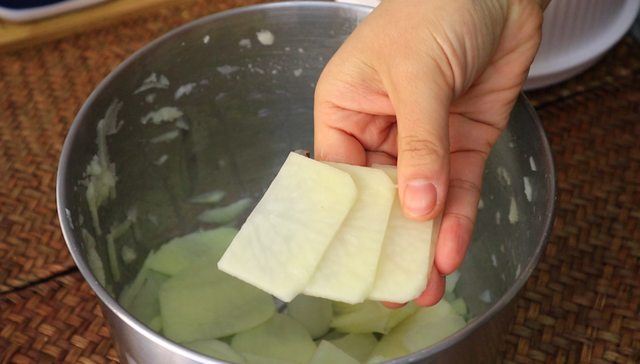 第一步、去皮后的土豆放入料理机里切片,不喜欢切成的姐妹们,用这个料理机真的很方便,蔬菜切片切丝,轻松就能搞定,,再也不用担心切成伤到手了。切好的土豆上锅蒸熟。