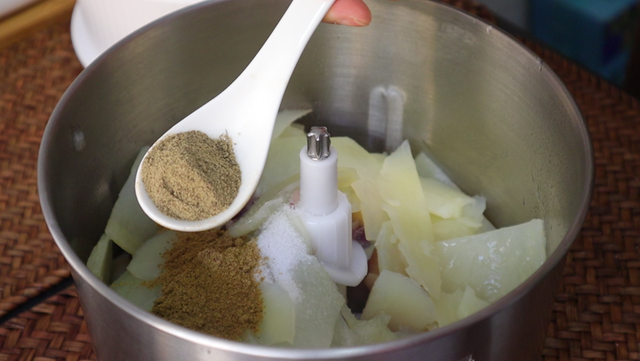 第四步、鸡胸肉切成小块放到料理机里,放入切好的洋葱和蒸好的土豆,加盐、五香粉、黑胡椒粉,然后把它们搅拌混合,尽量搅拌的比较细腻一些。