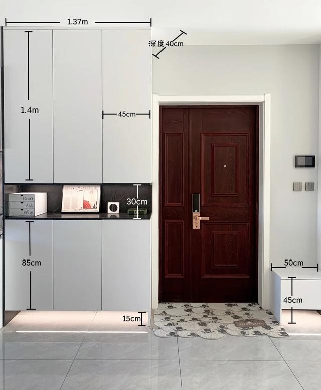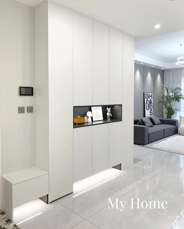 立式鞋柜无把手设计,视野极小,看起来更清爽。可以让空间感觉不杂乱,美观,同时又有足够的收纳空间。还设计了换鞋凳,不仅方便我们坐着换鞋,下面的抽屉还可以存放东西。